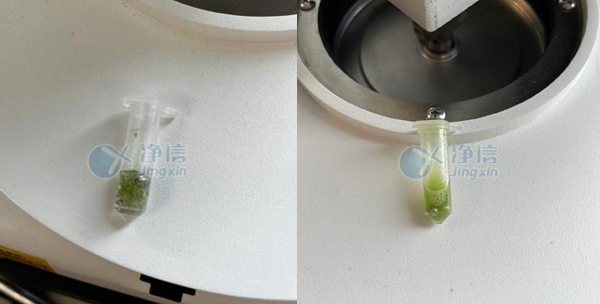 (左:擬南芥葉片裝管圖,右:研磨效果圖)