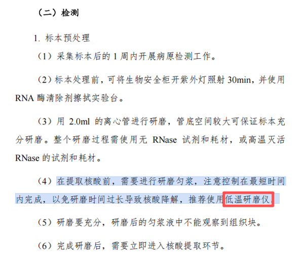 在病媒生物樣本保存與處理中,涉及RNA等易降解物質(zhì),冷凍研磨儀優(yōu)勢(shì)凸顯。當(dāng)組織需置于RNA later保存液或超低溫環(huán)境,冷凍研磨儀可在低溫條件下研磨,避免RNA因研磨產(chǎn)熱降解,保障病原核酸檢測(cè)的準(zhǔn)確性。無論是病媒生物病原學(xué)監(jiān)測(cè)的常規(guī)樣本,還是特殊保存條件的樣本,冷凍研磨儀都能穩(wěn)定輸出高質(zhì)量研磨效果,適配《技術(shù)指南》中多樣本類型處理需求。