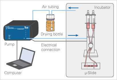 The ibidi Pump System consists of two main components: The ibidi Pump (computer controlled air pump, placed outside the incubator) and the Fluidic Unit (holder for cell media reservoirs and μ-Slide, tubing, and electrically controlled valve set, placed inside the incubator). By using this "split" approach, the closed circulation of the medium can be assembled separately in the laminar flow hood and transferred to the microscope or the incubator, without compromising the sterility of the system. The open architecture using the Luer connectors allows the use of any kind of flow devices. The PumpControl software controls the pressure, and subsequently the shear stress acting on the cells, and provides the possibility to program complex flow patterns.