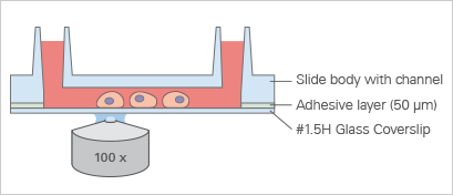 The μ-Slide I Luer Glass Bottom comes with a thin #1.5H Glass Coverslip Bottom that has the highest optical quality and is ideally suitable for high-resolution microscopy, TIRF, and super-resolution microscopy. To promote cell attachment, a surface coating might be required prior to cell seeding.
