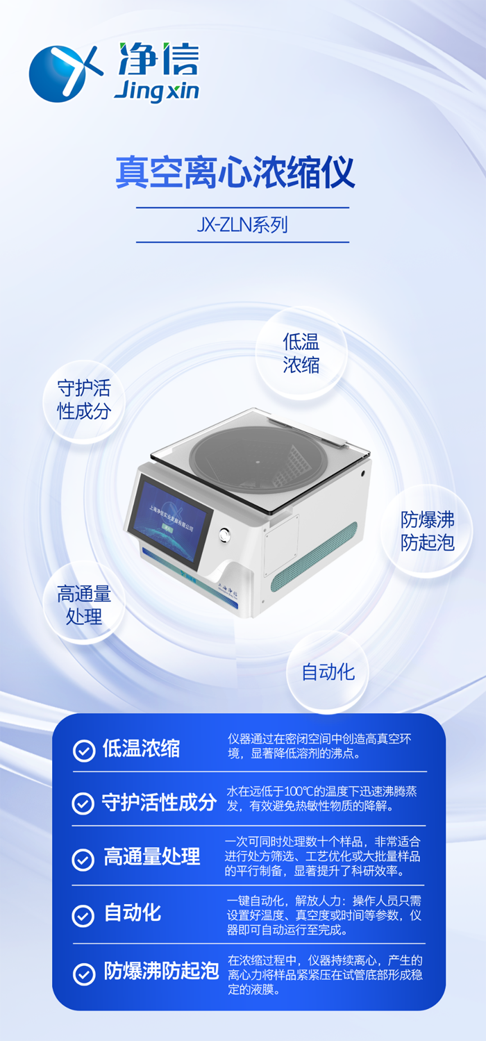 真空離心濃縮技術(shù)的出現(xiàn),提供了解決方案。凈信真空離心濃縮儀集真空、離心、加熱三大技術(shù)于一體,其優(yōu)勢正是針對傳統(tǒng)方法的痛點而來。