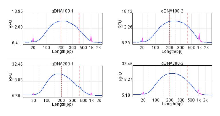 在投入量分別是200ng時(shí),通過Qsep100片段分析儀檢測,打斷的DNA片段在200-400bp區(qū)間占比分別是47.7%、49.2%、49.1%;片段平均值分別是290.3bp、287.6bp、283.7bp,