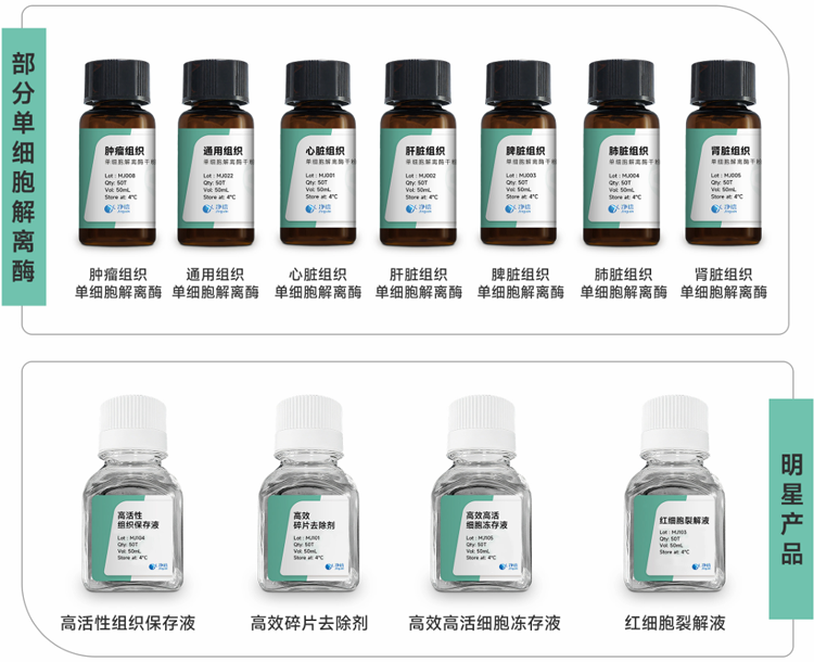 上海凈信推出了一系列針對不同組織的特異性單細(xì)胞解離酶,專為高質(zhì)量單細(xì)胞懸液制備而設(shè)計(jì)。產(chǎn)品采用了高純度、多元化酶配方,可快速、溫和解離組織樣本,最大限度保持細(xì)胞活性和完整性,適用于各類原代細(xì)胞提取、培養(yǎng)、流式分析、類器官、腫瘤組織解離及單細(xì)胞測序等研究。